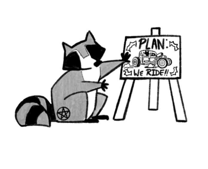 Profanely spawned during THE ONE HUNDRED ONE PAGE GAMES JAM in October of 2025, this game combines two gloriously unhinged games written by Grant Howitt (The Witch is Dead, Crash Pandas). It answers the question, "If a gang of bargain-basement LA gang members from a Major Street Racing Movie managed to murder a witch, would that witch's adorable familiars enter a car race to bring her back to life?" and the answer provided is "YES, probably."